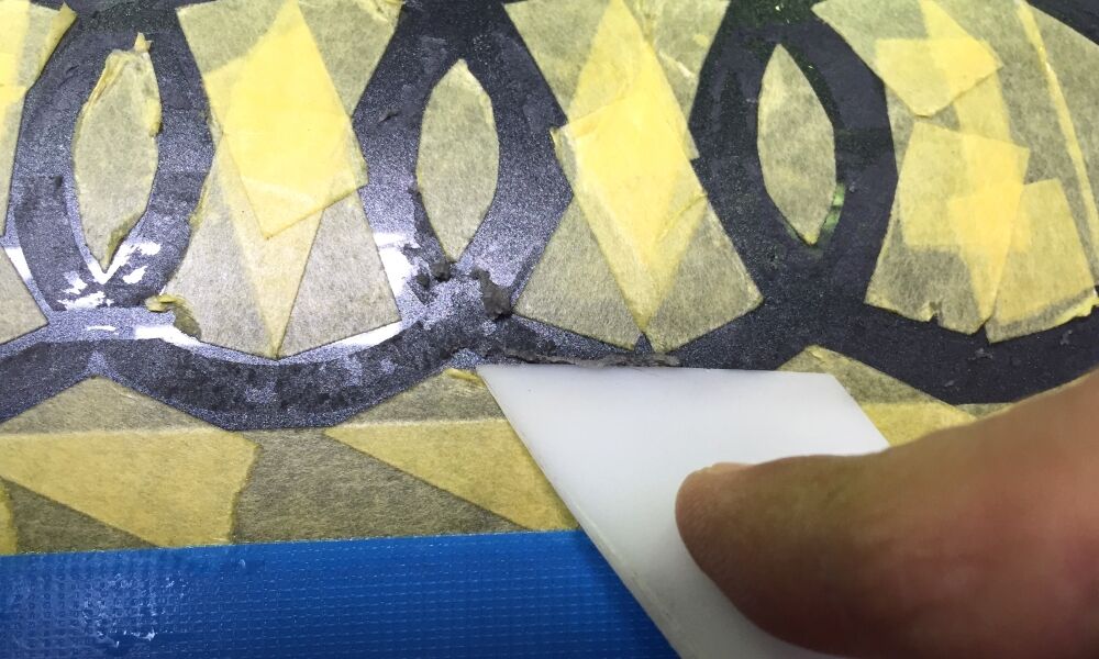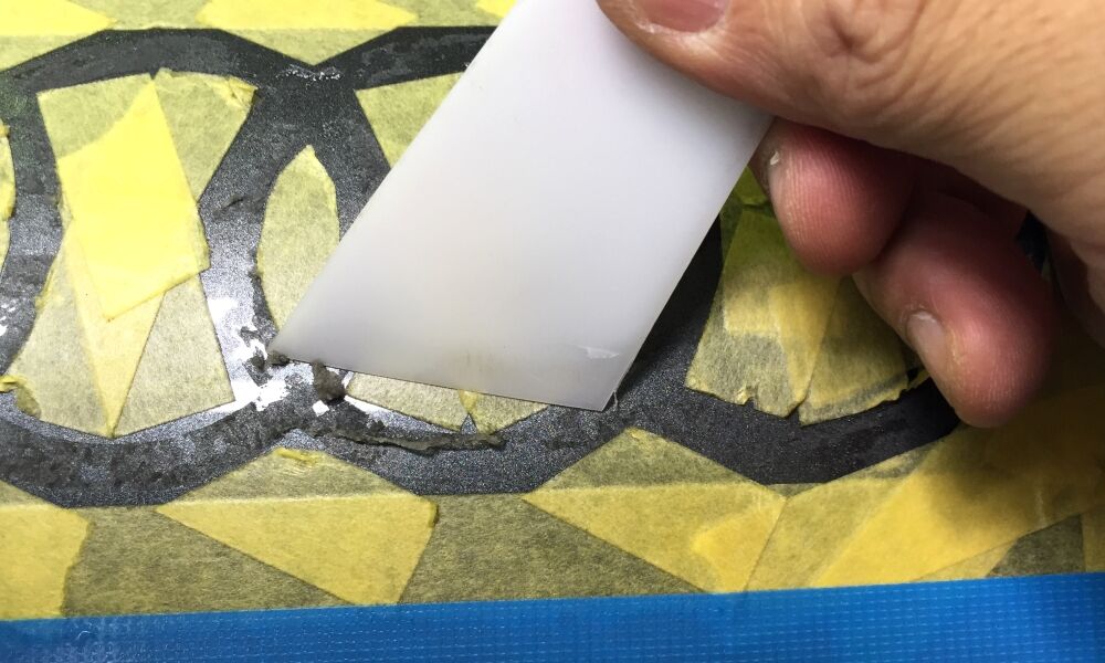 だんだん気持ちが散漫になってくると、なんとなくその辺りを全体的にガーっと一気にこそげないかなぁ、などと狙いのハッキリしない漫然としたスクレーパーの使い方になり易いです。横着、ガサツ、ずぼらは、この作業には大敵です。剥がしたカスはそのまま下に落とすと、バンパーにあたりを汚したり、床に散らかすと履物の裏にくっついたりして始末に悪いので、すぐ脇に裏返した養生テープを貼って回収していきます。単調な作業ですが、回収したカスが溜まると成果物のようで多少の励みにもなります。