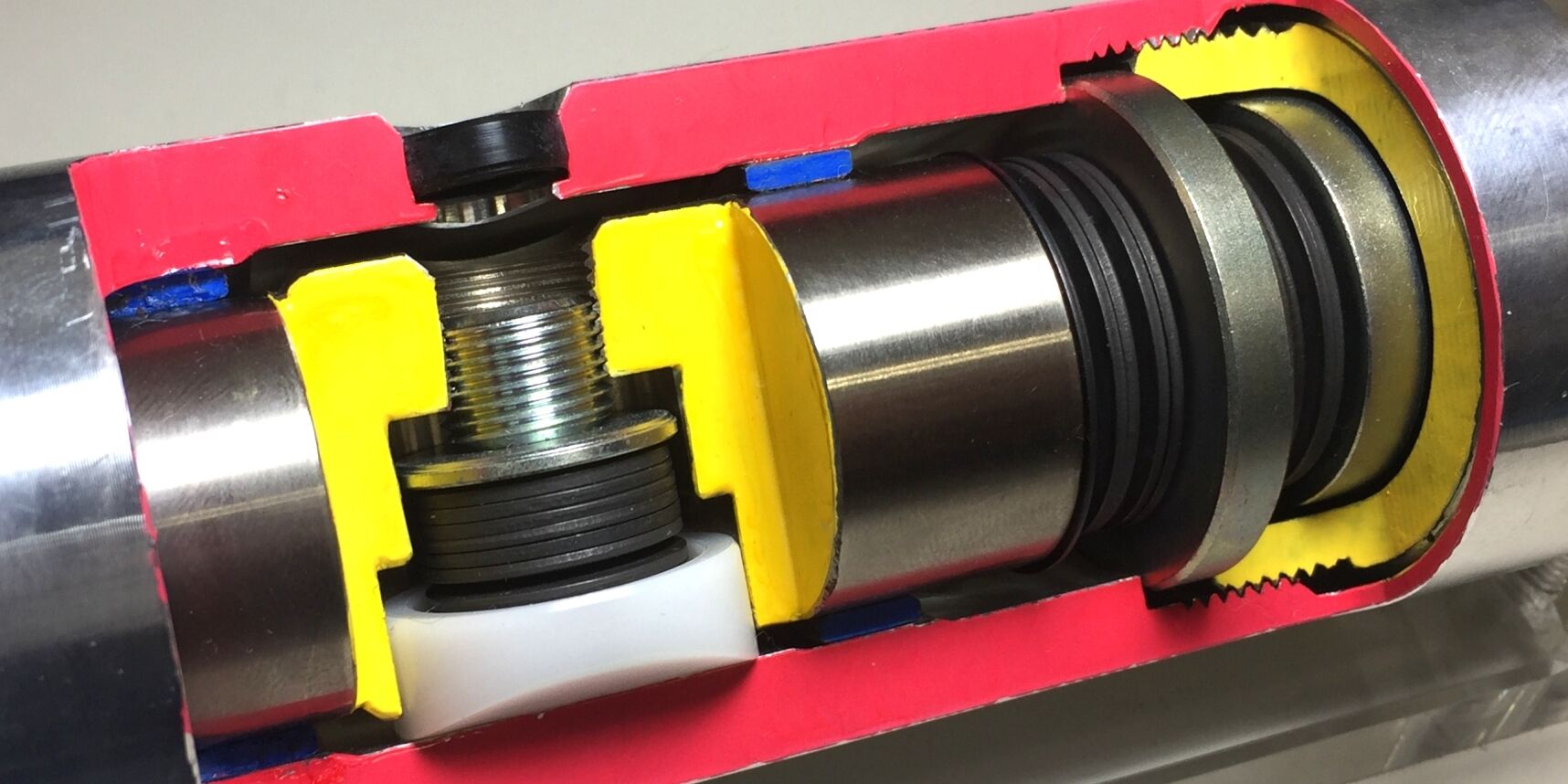 写真右寄り、黒い円盤が幾重にも重なっているのが、ディスクスプリングです。コイルスプリングに比較して、ディスクスプリングの特徴として、コンパクトに、短いストロークで極めて高いスプリングレートを発揮できる点があります。ボディ変形はMCBの装着部位(両端の間隔)においてストローク量(変形量)が高々1mm程度で、変形に関わる力は1000N〜数千Nという大きな力です。これを現実的なサイズのコイルスプリングで受け止めることは不可能で、まさにディスクスプリングがうってつけです。