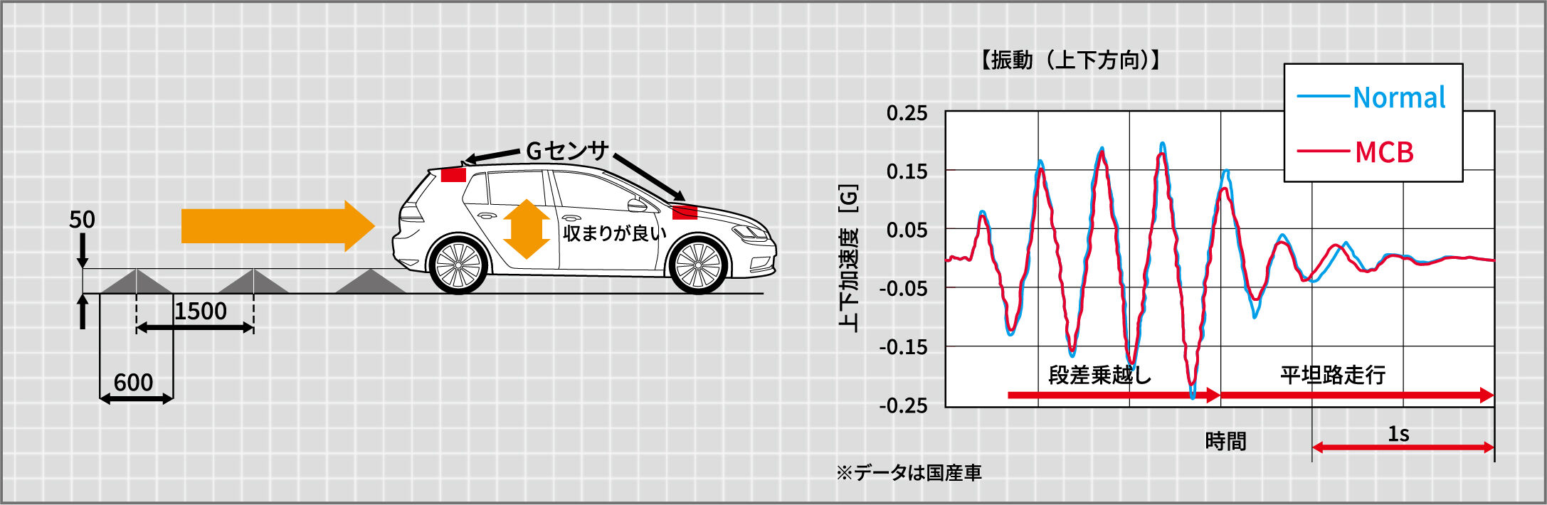 注目すべきは、前輪が最後の段差を越えて平坦路に進んだところで、より顕著な違いが表れています。この区間での「揺れの残り」はMCB装着でピークが抑えられ、位相も早められており、揺れの収束に寄与していることが分かります。このテストではデータ測定のために15cmという大きな段差を用いていますが、実際の走行では路面の継ぎ目や車庫から出る際の小さな段差でも、同じ効果をハッキリ体感できます。グラフでは僅かの差に見えますがドライバーの感覚はとても繊細です。MCBはゆっくり走っても十分に効果を体感できるボディパーツです。