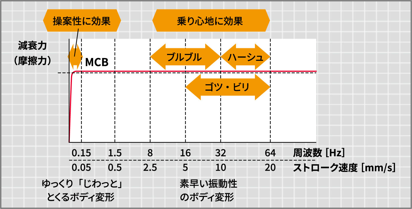 この極めてゆっくりな振動(変形)に対しても確実にダンピングを発揮できるのが、カットモデルの白い部品、つまりフリクションダンパーなのです。これにより、ボディはじわりと抑制の効いた変形をするようになり、無用なオーバーシュートが無くハンドリングはスッキリした応答になります。つまりナヨナヨする感じがなくなるわけです。上のグラフは、MCBが超ワイドレンジなダンピング特性を持つことを示しています。8Hzを超えるブルブル、ガタピシの領域はオイル式等でもダンピングが可能ですが、0.5Hz以下で十分なダンピングを発揮できるのはフリクションダンパーだけです。