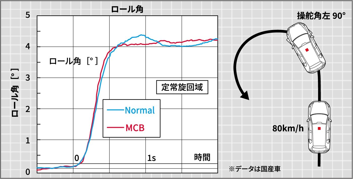 挙動安定の効果は、前編でご紹介したレーンチェンジ以外に、「Jターン」のテスト走行でも確認しているのでご紹介します(データは国産車)。定速80km/hの直進で侵入し、決められた通過点でステアリングを一気に左90°に操舵します。車両のコンソール中央にロール角速度センサを固定して実測した結果が上のグラフです。ノーマルの車両はロール角のオーバーシュート、アンダーシュート、いわゆる「揺り返し」があり、収束まで約2秒を要していますが、MCB装着車ではそれがほぼ無くなっています。