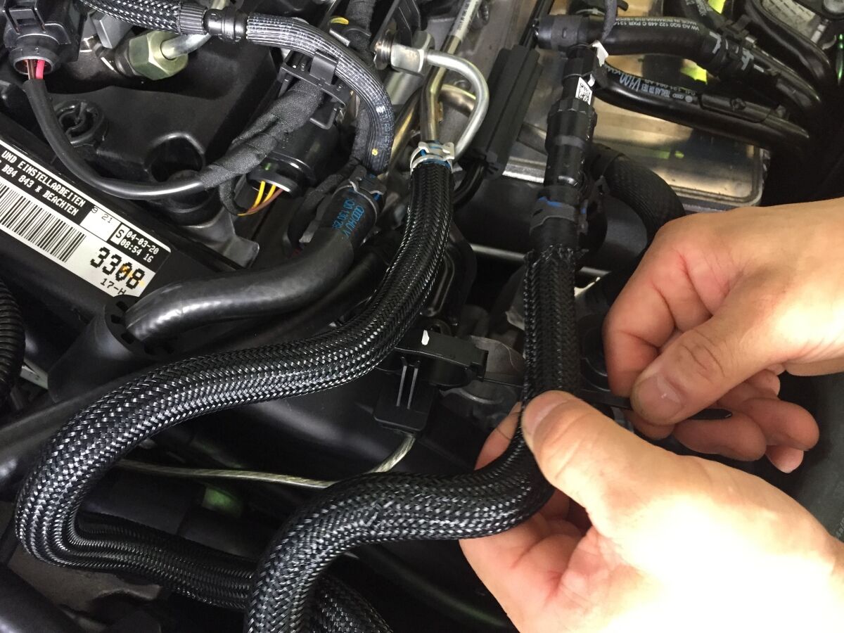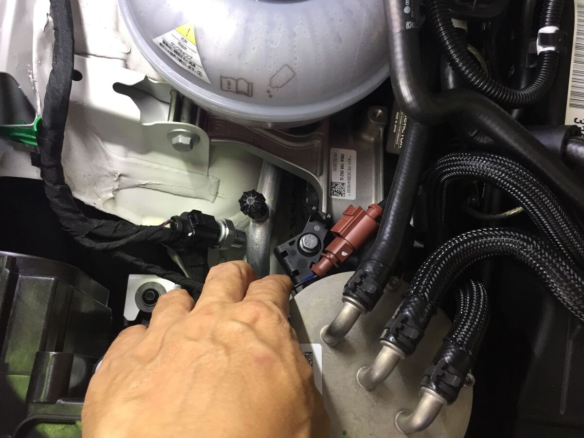 配線は、ホースのクランプに結束バンドで固定しました。ホースやクランプのレイアウトは車種により違っていると思いますので、美的に納まるように結束バンドで固定してください。あとは、エンジンカバーを元のように装着して、完了です。