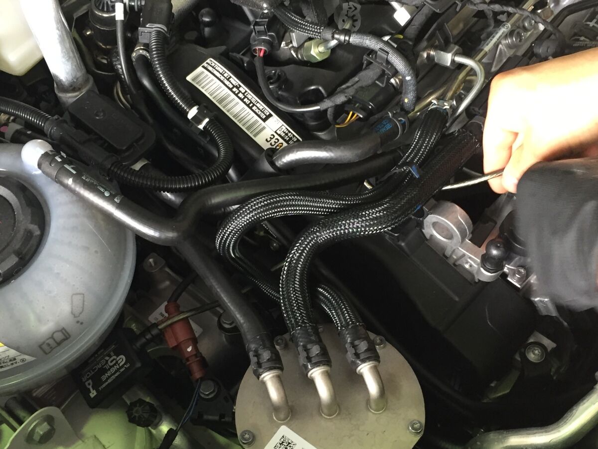 エンジンオイルリアクター本体は、エンジンマウントの上にぴたりと納まります。この車両の場合は茶色のコネクタが作業の邪魔でしたので一旦クランプから外して作業しています。本体の装着位置も、性能には関係しませんので、補器類のレイアウトがこの写真と異なる場合は、現車に合わせて一番カッコ良くしっくりと納まる位置に装着してください。