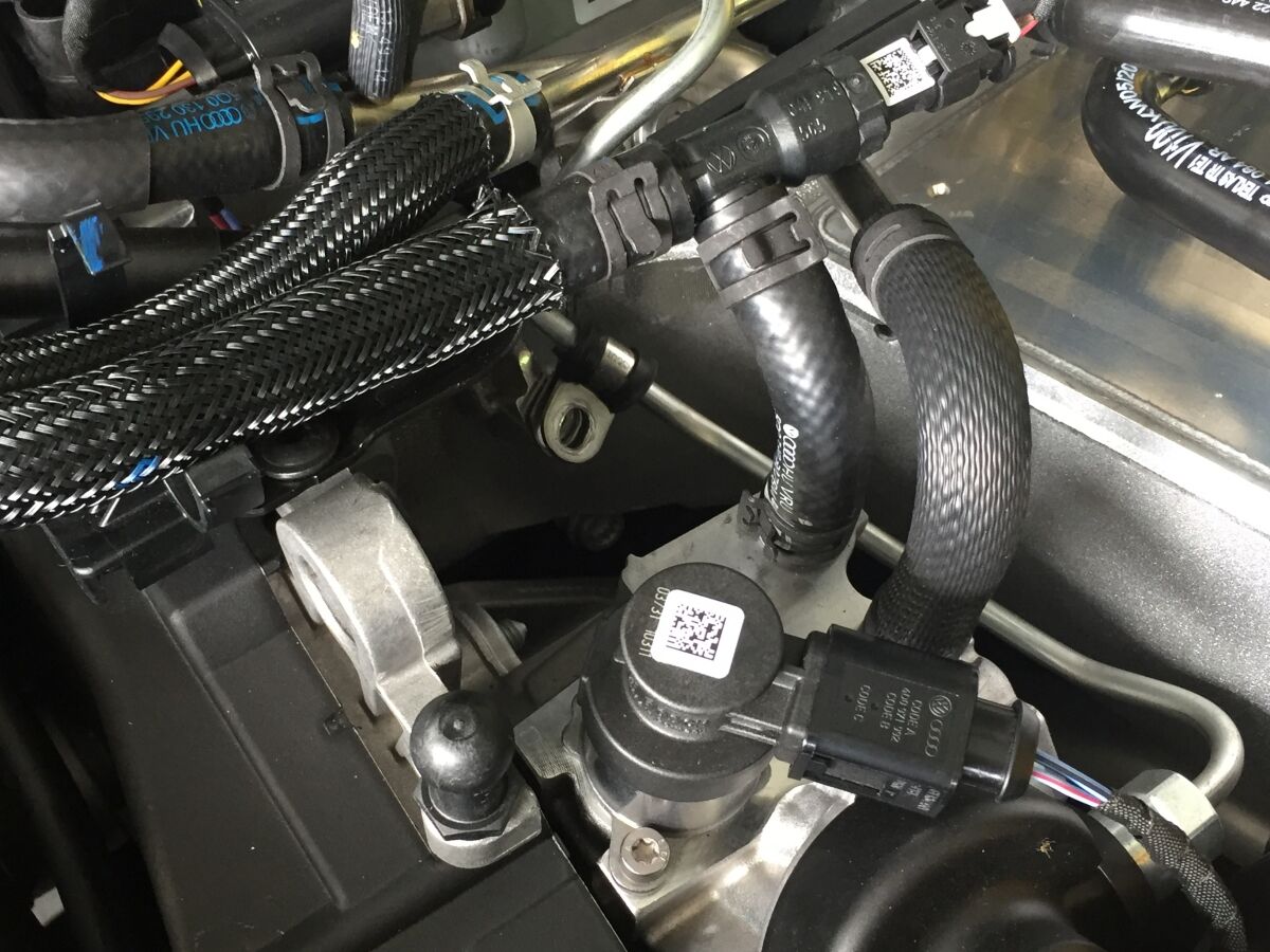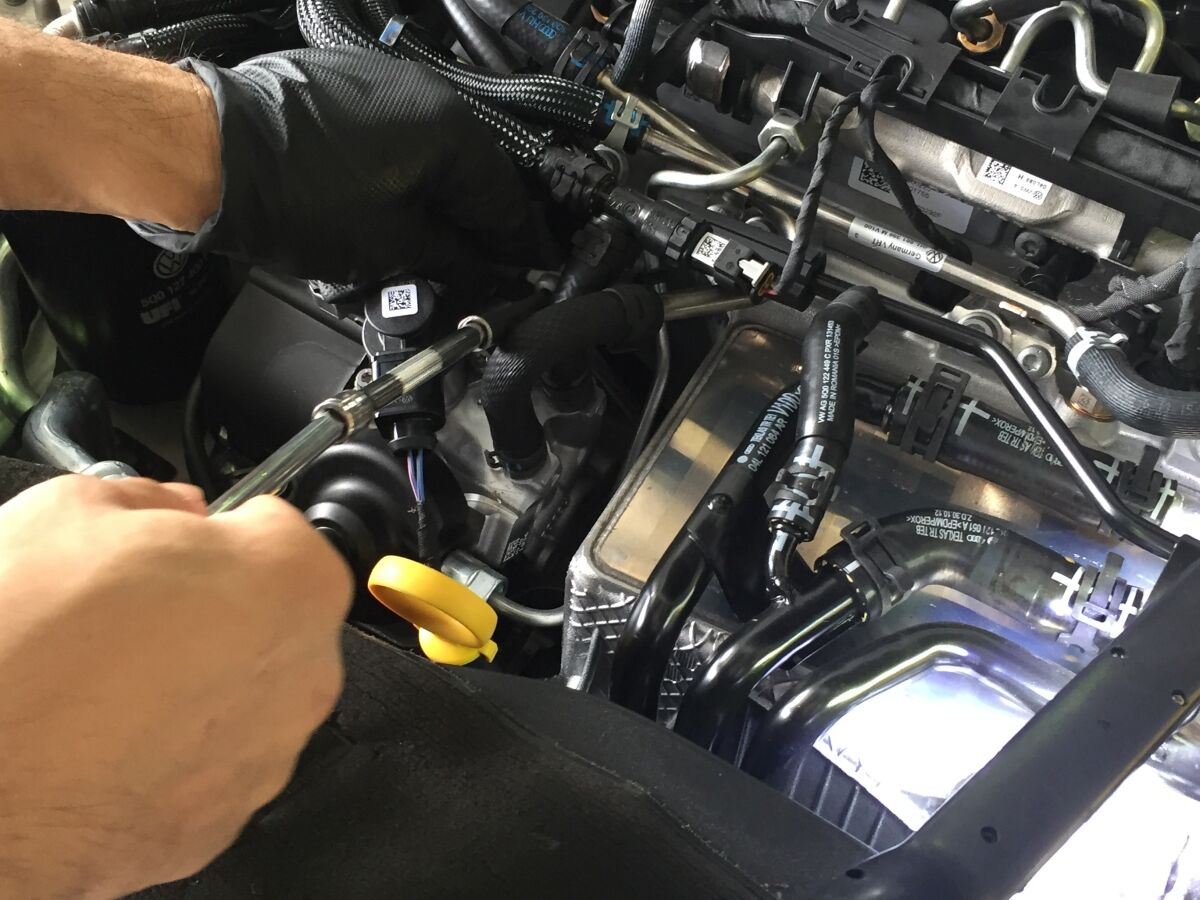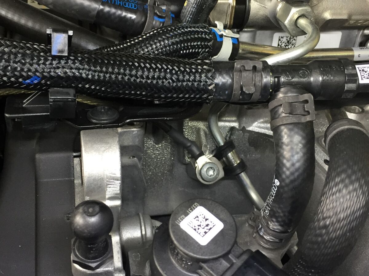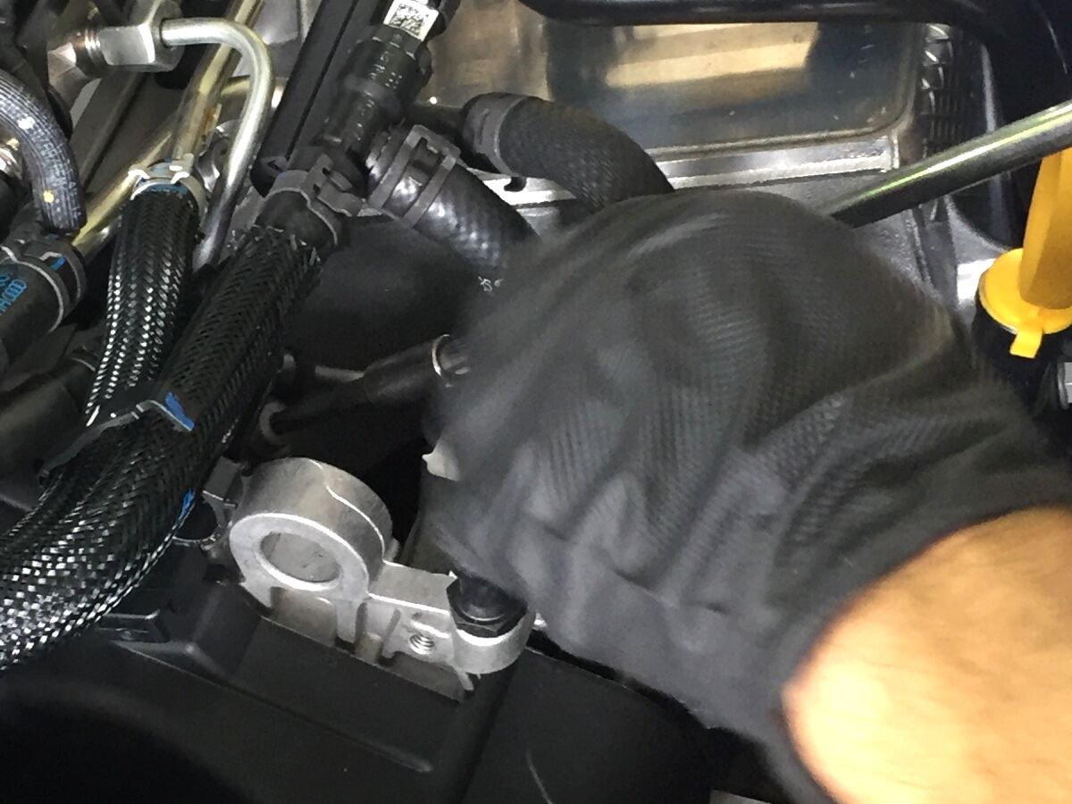 2.0TDIエンジンへの、エンジンオイルリアクターの端子の接続は、写真の黄色矢印のネジです。やや奥まった位置なので、必ずエンジンの冷えている状態で作業してください。手が入り難い場合は、水色矢印のホースクランプを外すと作業し易くなります。