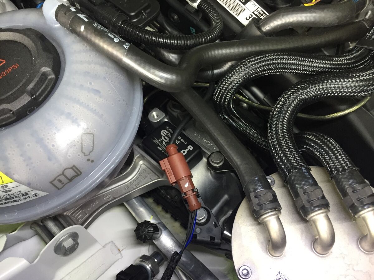 エンジンオイルリアクターは、本体をウォッシャータンク付近に仮置きして、配線を適切なルートを通してネジの位置まで引き込みます。配線はどのルートを通しても性能に変わりはありません。美的に納まるルートとしては、他のホース類よりも下側を通すのが良いと思います。