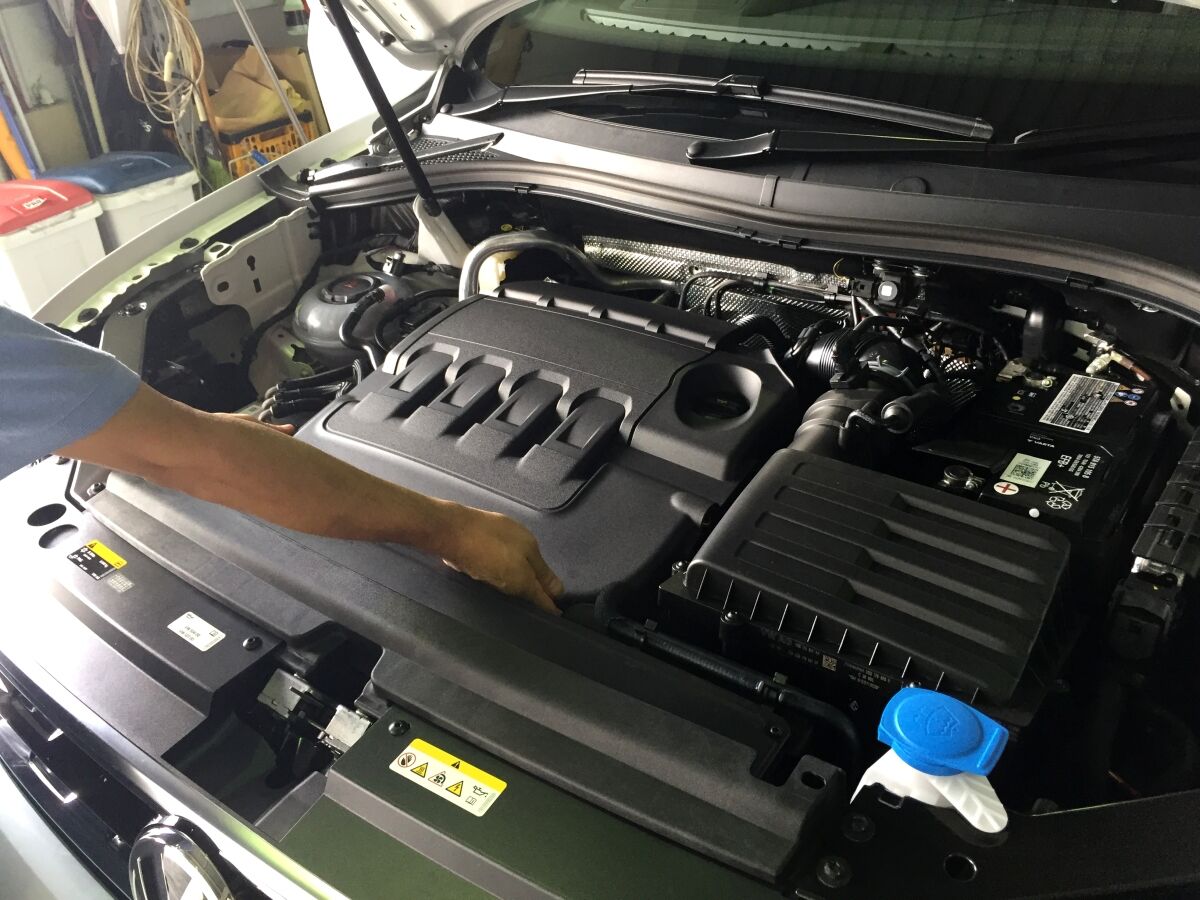 ボンネットを開き、エンジンカバーを外します。エンジンカバーは4隅付近の裏側がパチンと嵌まっているだけですので、真上に引っ張ると外れます。嵌まっている個所の見当をつけながら外してください。