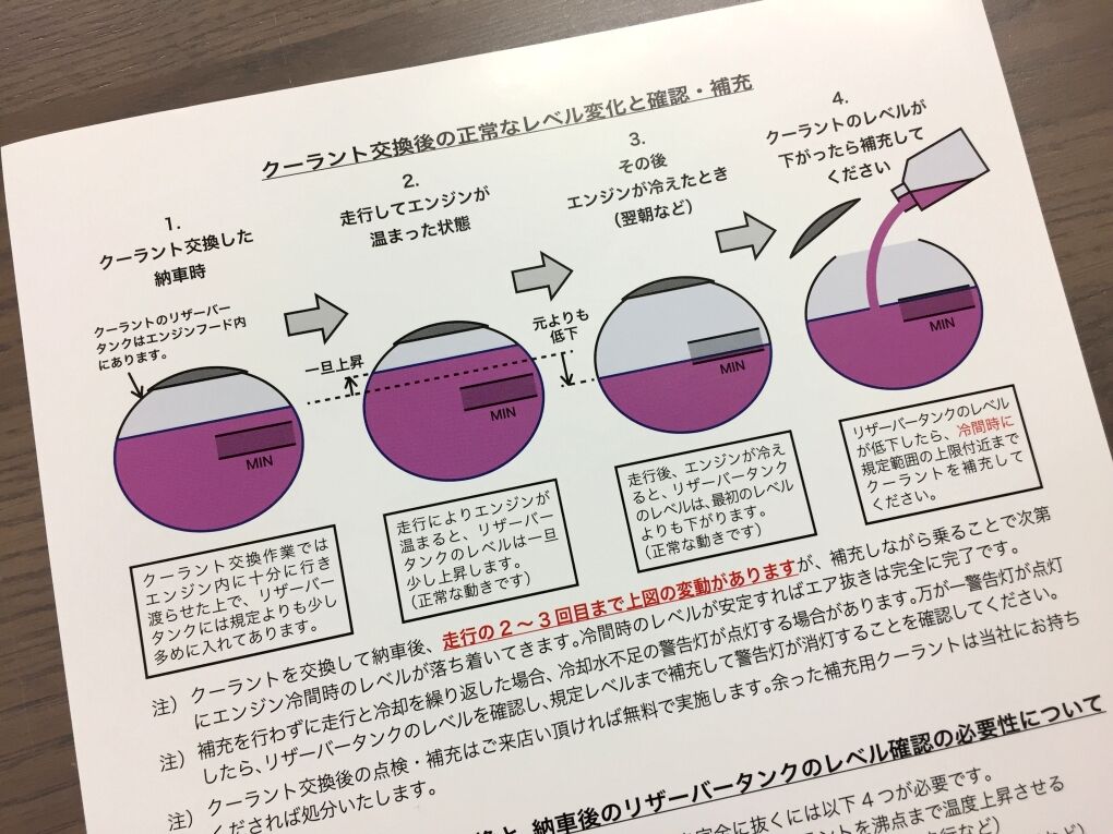 maniacs STADIUMでクーラントを交換して車をお客様にお戻しした後、お客様が普段通りにお乗りになって、リザーバータンクの液量が完全に安定するまでに1~2週間くらいかかります。その間に液面レベルが低下した分の補充用として、maniacsでは出庫時に希釈済みクーラントを500ml程度お客様にお渡ししています。2年くらい前からそのようにしております。