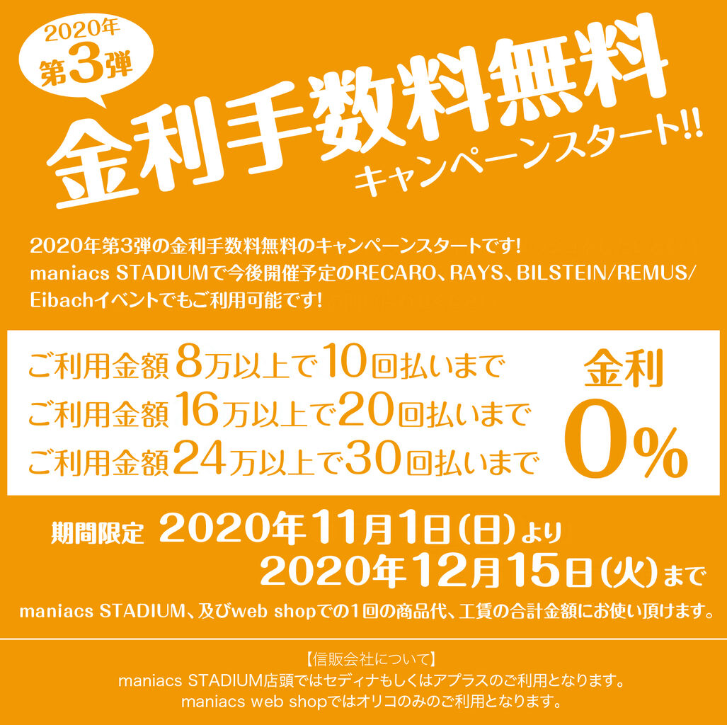 2020年10月30日 【スタッフ日誌】金利手数料無料キャンペーンは11月1日(日)よりスタートいたしました! マニアックス遠藤です2020年3弾ショッピングローン金利手数料無料キャンペーンが、maniacs STADIUM、maniacs web shopともに11月1日(日)午前9時からスタートいたしました。11月に予定しております、RACARO、RAYS、BILSTEIN、REMUS、Eibachの店頭イベントのお支払いにもご利用いただけます!期間限定での開催になりますので、この機会に金利手数料無料のショッピングローンをご活用ください! タグ :#金利手数料無料#キャンペーン 「スタッフ日誌」カテゴリの最新記事 < 前の記事次の記事 >