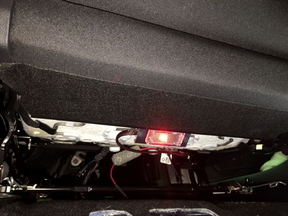 ブラケットを前席シートのフレーム下に差し込んで装着し、配線を接続して完了!今回はお客様のご要望で、点灯色をレッドにしたいとのことで、灯体内部のLEDも赤色の素子に交換しています。