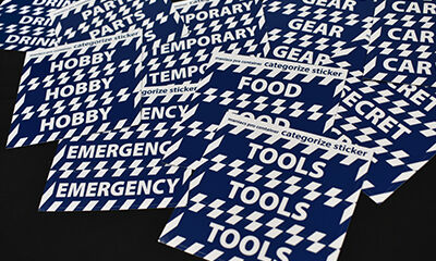 それで、PROコンテナを外から見ただけで何を入れたか区別できるように、コンテナの開発と並行して「専用カテゴライズステッカー」のデザイン作業を進めてきました。コンテナ本体に遅れること3日でそのステッカーが先ほど入荷しまして、早速新発売しました!!