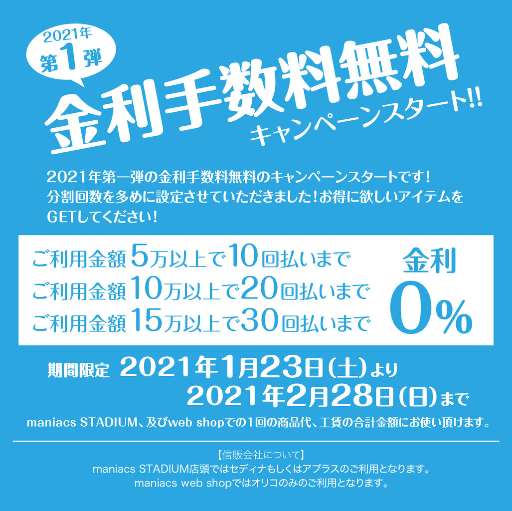 maniacs STADIUM、maniacs web shopともに1月23日(日)午前9時からスタートです。