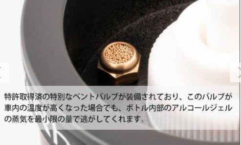 夏など車内温度が高温になった場合にも、ボトル内部に特許取得済の特別なベントバルブが装備されており、このバルブがボトル内部のアルコールジェルの蒸気を最小限の量で逃がしてくれるという優れものになっています。暑い時期に車を太陽の下に放置しておいても、容器の変形や爆発などといった心配もなく、安心してご利用頂けます。
