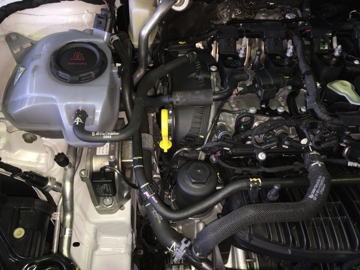 Polo(AW1) GTIは、2.0TSIエンジンですので、掲載済みの接続個所の通りでOKですが、冷却水リザーバータンクのレイアウトがGolf等と異なるため、エンジンマウントの上に本体を装着できません。Poloは写真のようにエンジンマウントの前面に、付属の両面テープでピッタリと装着できます。見た目にもカッコいい感じに納まります。