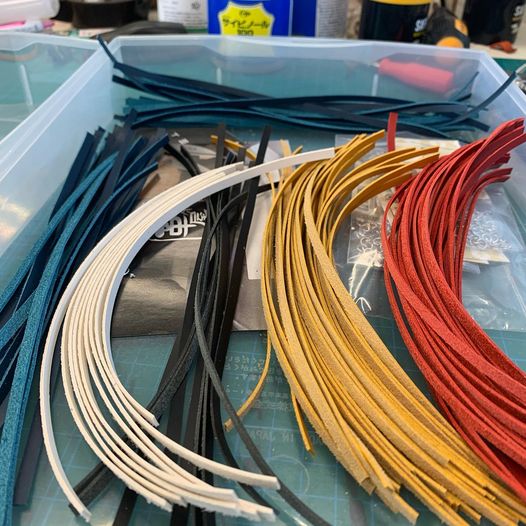 新ロゴタイプを使ったmaniacs シフトブーツ バングル for VWは、鋭意製作中です。左写真は、革茶屋さんのFacebookページから拝借しました。革素材を、細く均等な幅にカットするのは専門的な技術と設備が必要です。