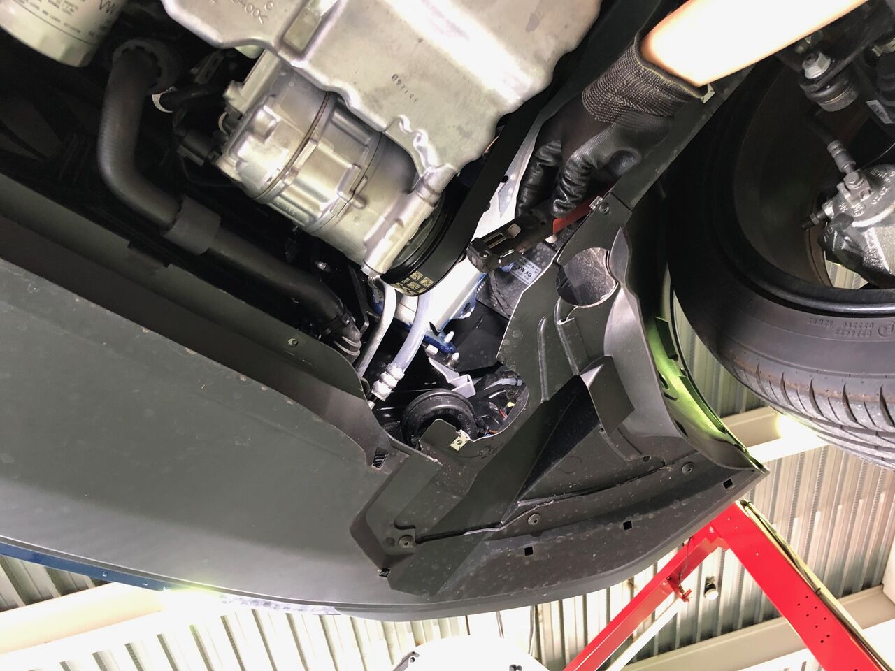Polo(AW1) のホーンは、写真のようにバンパー右側の内部にあります。バンパーは外さなくても、アンダーカバーを外すだけで下から簡単にアクセスできます。ノーマルホーンの位置を確認しブラケットごと外します。