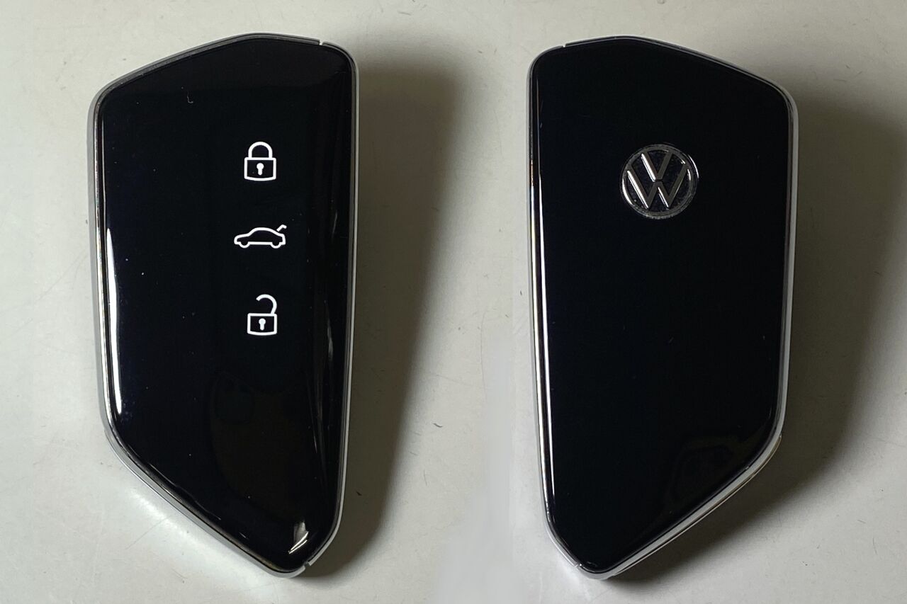 Golf8は、それまでのVW各車種とスマートキーの形状が異なっています。キーの形状は、左右非対称でどの辺も並行でも直角でもない不規則な六角形ですが、個性的でありつつも、スッキリしたシンプルな印象の、とてもスタイリッシュなデザインとなっています。