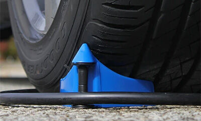 ホースガイドのセッティングは、簡単です。停車中の車に後つけでタイヤの下にスライドさせるだけです。
