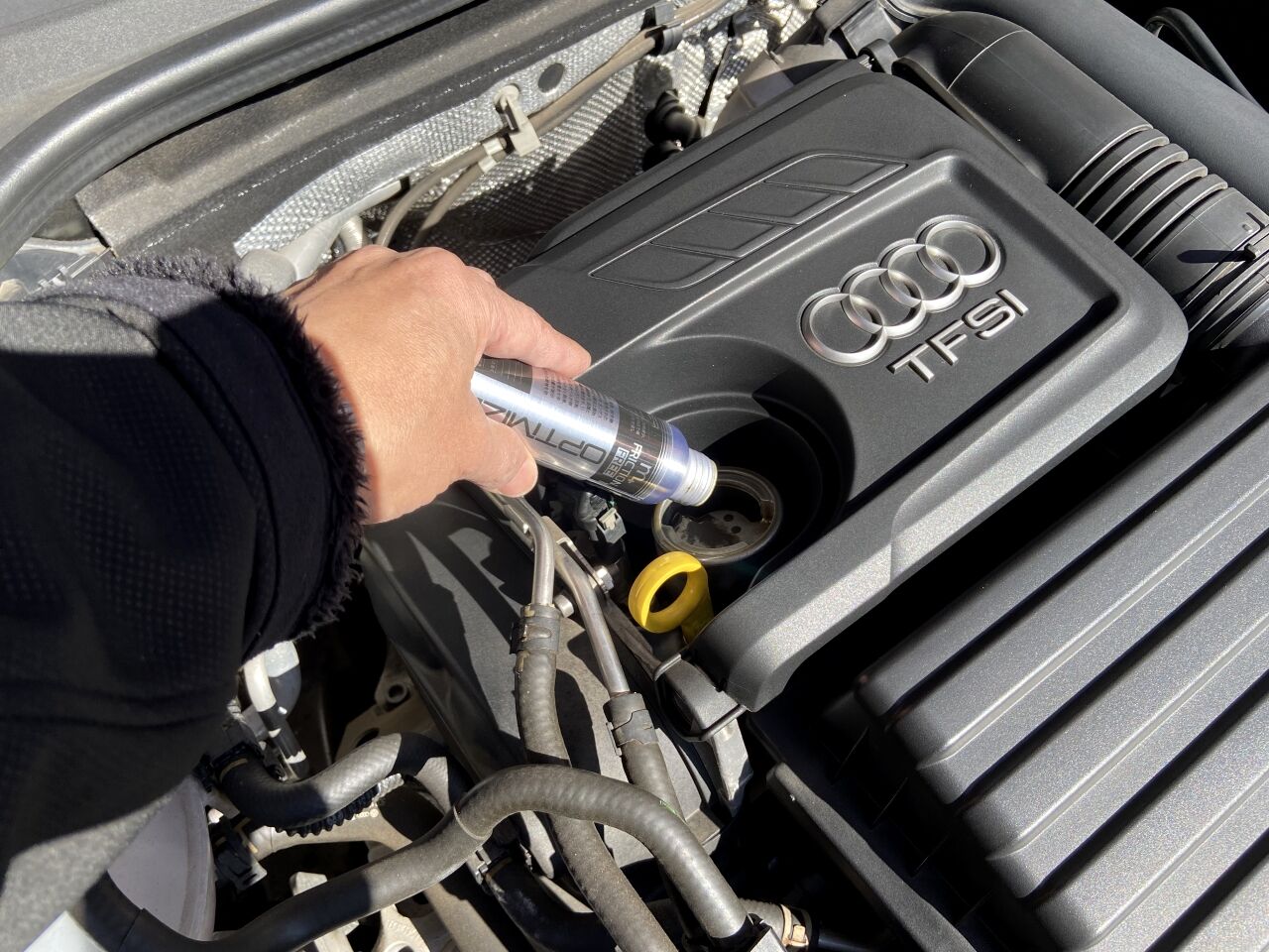 この添加剤の開発には、工房長も終始がっちりと関わっており、愛車での評価はA1(8X前期)の方で行っていました。愛車のA1は、エンジンの回転感覚がややゴロゴロしていて、少し回転をあげるとガサついた感触があって、音も振動も大き目、高回転では頭打ち感があるので、添加剤の効果を確認するには丁度良かったからです。A3の方は、比較評価のために市販の後入れ添加剤をいろいろ入れて試すのに使っていたので、A3にm+ FRICTION FREE OPTIMIZERを投入するのは今回が初めてです。