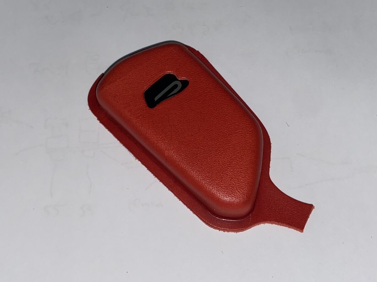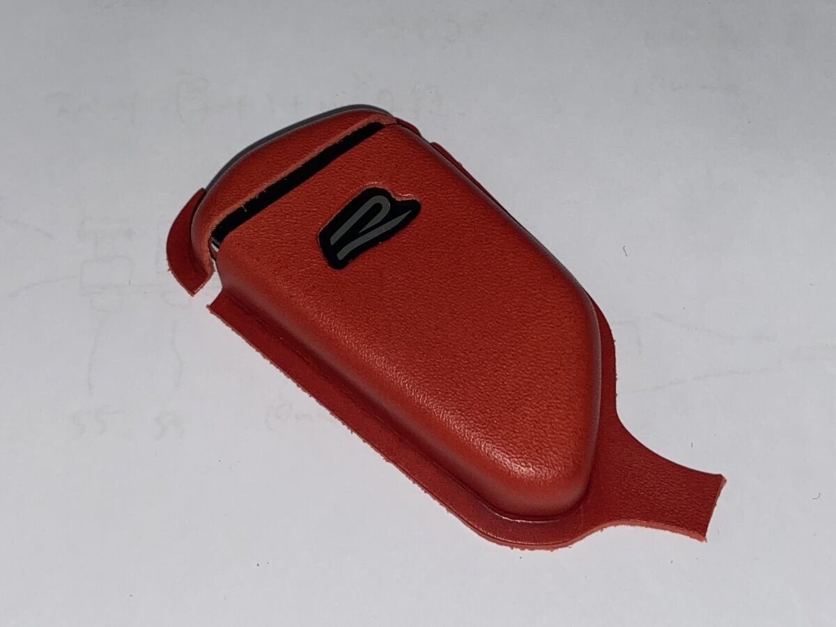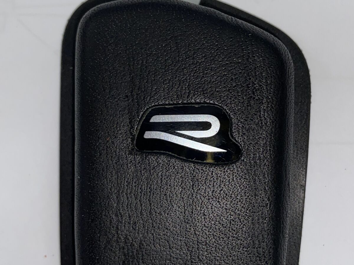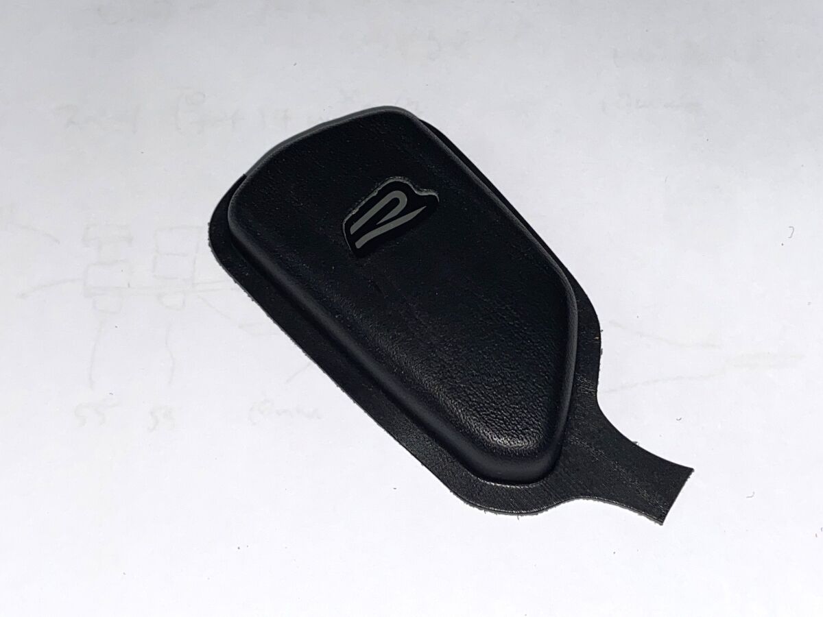 こちらの黒い革の写真が、2回目の試作サンプルです。穴の位置は、概ね良い感じに納まりました。ロゴマークをかたどった穴の見栄えは、予想以上に素敵ですね。キーシェルを装着した状態でもRであることが一目で分かります。ロゴマーク自体に特別感というか、独特の高級感がありますし、レザーの質感とも相まって、タダ者ではない雰囲気が醸し出されています。車両との統一性という意味でもバッチリかと。