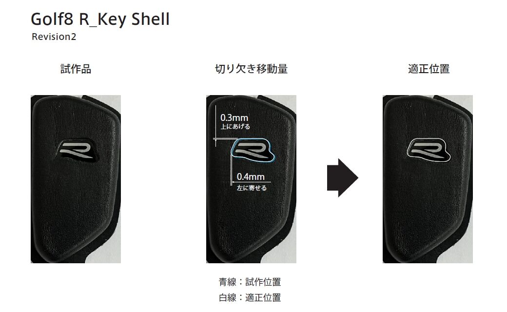 1回目の試作サンプルがこちら。現在販売しております、Golf8用レザーキーシェルのFタイプとの違いは、ロゴマークの穴の形です。R以外の車両のキーはロゴマークが円形のVWマークで、キーシェルの穴もそれに合わせた円形です。RのキーはRのロゴマークですので、それに合わせた穴にします。