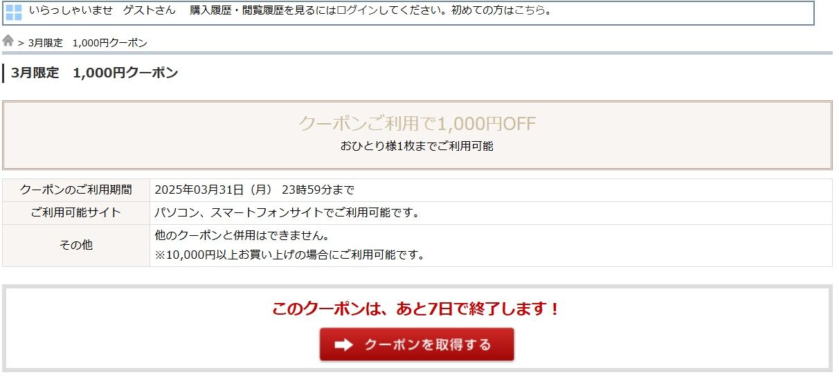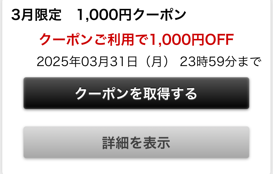 3月限定クーポン!3月31日(火)23:59までの期限までとなりますので、この機会をお見逃しなく!!