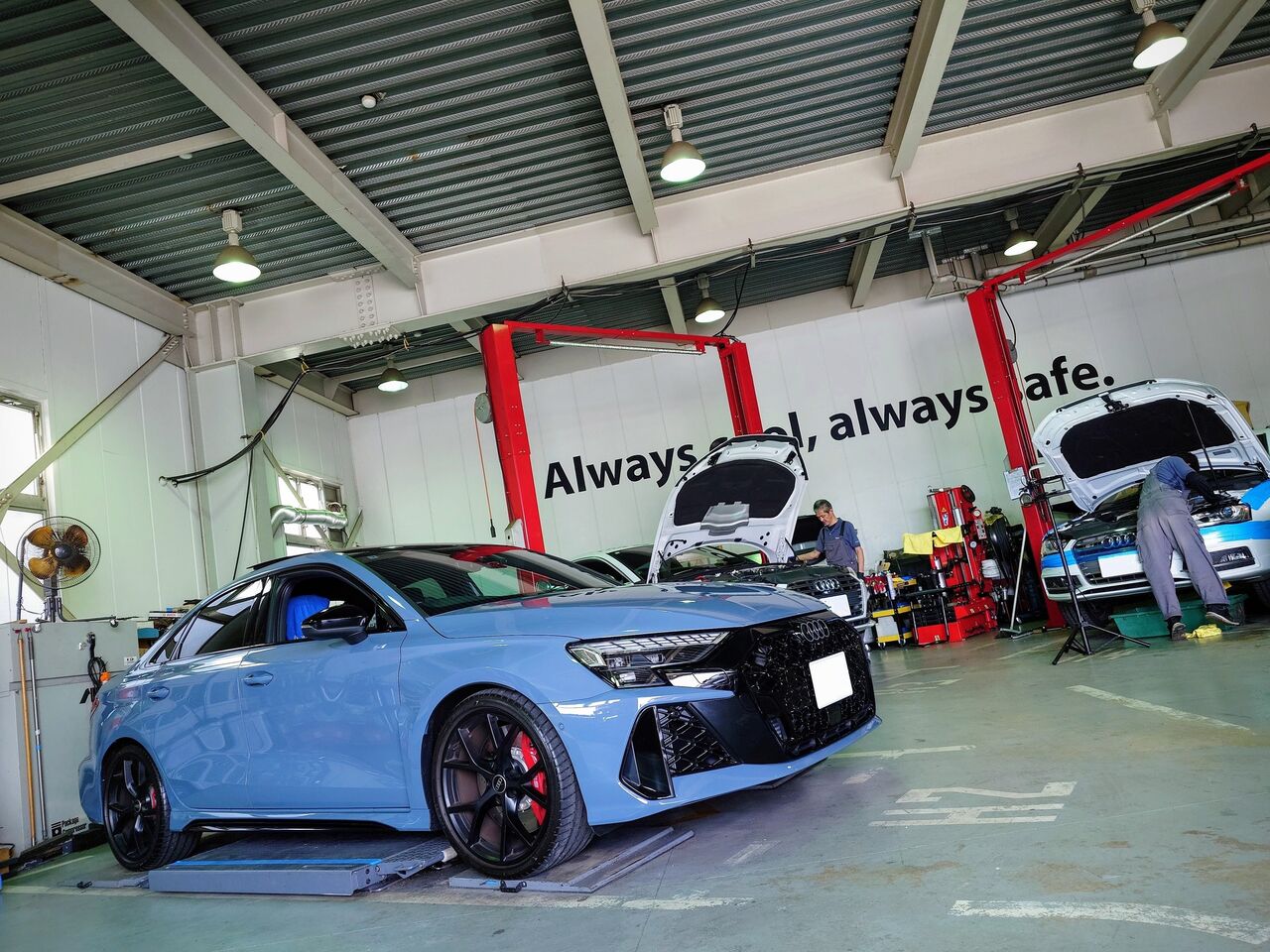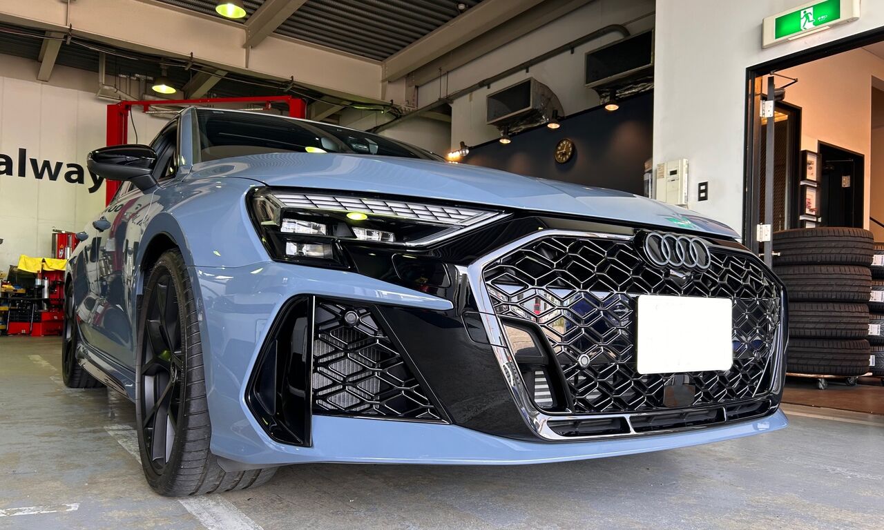 Audi RS3(8Y/後期)Sedanにご入庫頂きました。ケモラグレーメタリックのボディカラーが新鮮です!