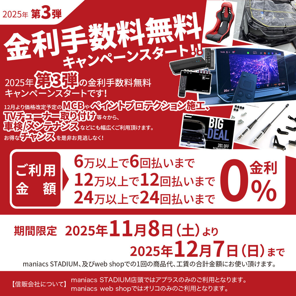 maniacs web shopでのお申込みは勿論、maniacs STADIUMでのお取り付け含めたお申込みにつきましても、ご来店を頂かなくてもご自宅でお申込み可能となります。詳しくはお問い合わせください。