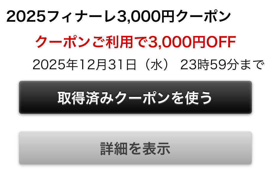 お得な2025フィナーレクーポン!12月31日(水)23:59までの期限までとなりますので、この機会をお見逃しなく!!