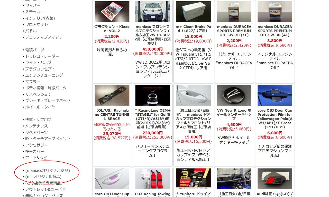 上記画像(画面はPC用)のmaniacs web shopのカテゴリー検索から、maniacsオリジナル製品/m+オリジナル製品を選択頂くと今回のクーポン対象商品が一覧で出てまいります。